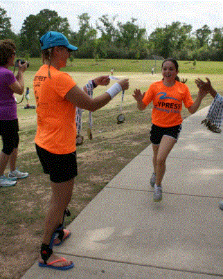 Without a doubt, the first ever Cypress Running Club family picnic has no doubt become the first ANNUAL Cypress Running Club family picnic. We had absolutely perfect weather (which, I think we were due given some of the crummy race weather we’ve been dealt this season!) for families to enjoy hanging out together. We are thankful for all the volunteers who helped out, and for our club members who brought yummy food to help make the picnic such a success. The tattoo station was a hit with the kids, as were the logo frisbee giveaways, but the highlight event was the 1.5 mile kids fun run. Nearly 90 (!) kids participated, and each one was beaming as they crossed the finish line and received a CRC finisher medal.